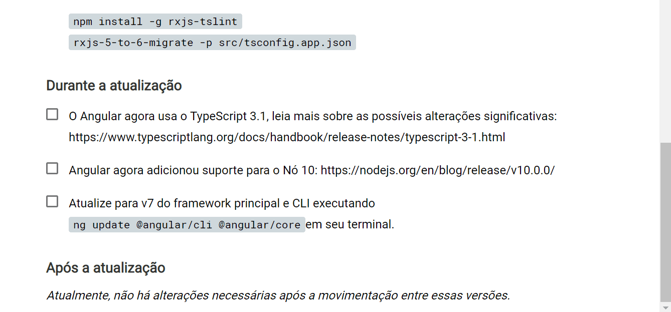 So, if you have a program developed in Angular 5 and want to move to version 6, there is a page that allows the update—the “Angular Update Guide”. You choose the versions you want and confirm the action.