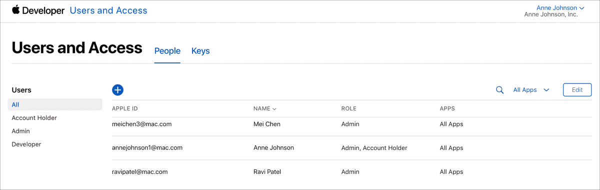 App Store Connect is designed to work with different people and different permission levels. The recommended flow is: each team member signs in with their own Apple Account and is invited to the team.