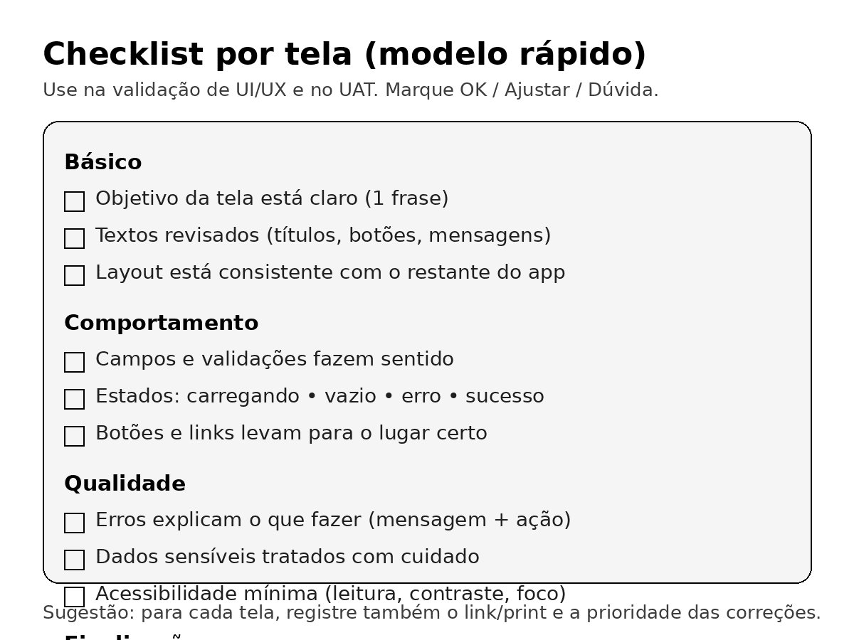 - A per-screen checklist template
