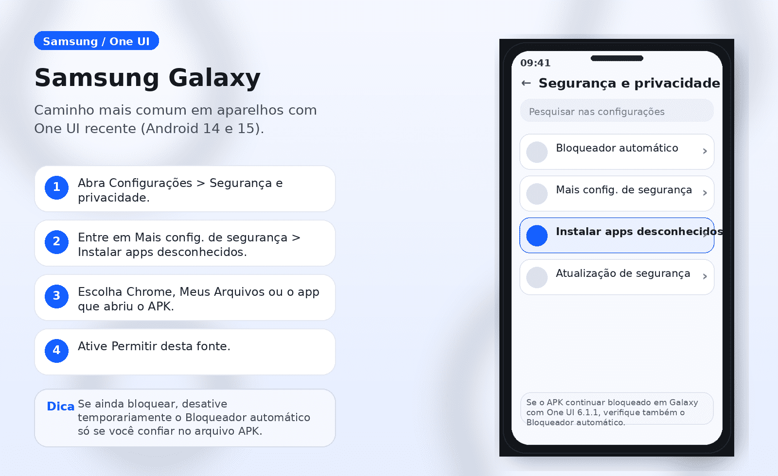 Em aparelhos Galaxy mais recentes, especialmente com One UI 6.1.1, o recurso Bloqueador automático pode impedir a instalação de APKs mesmo quando a fonte já está liberada.