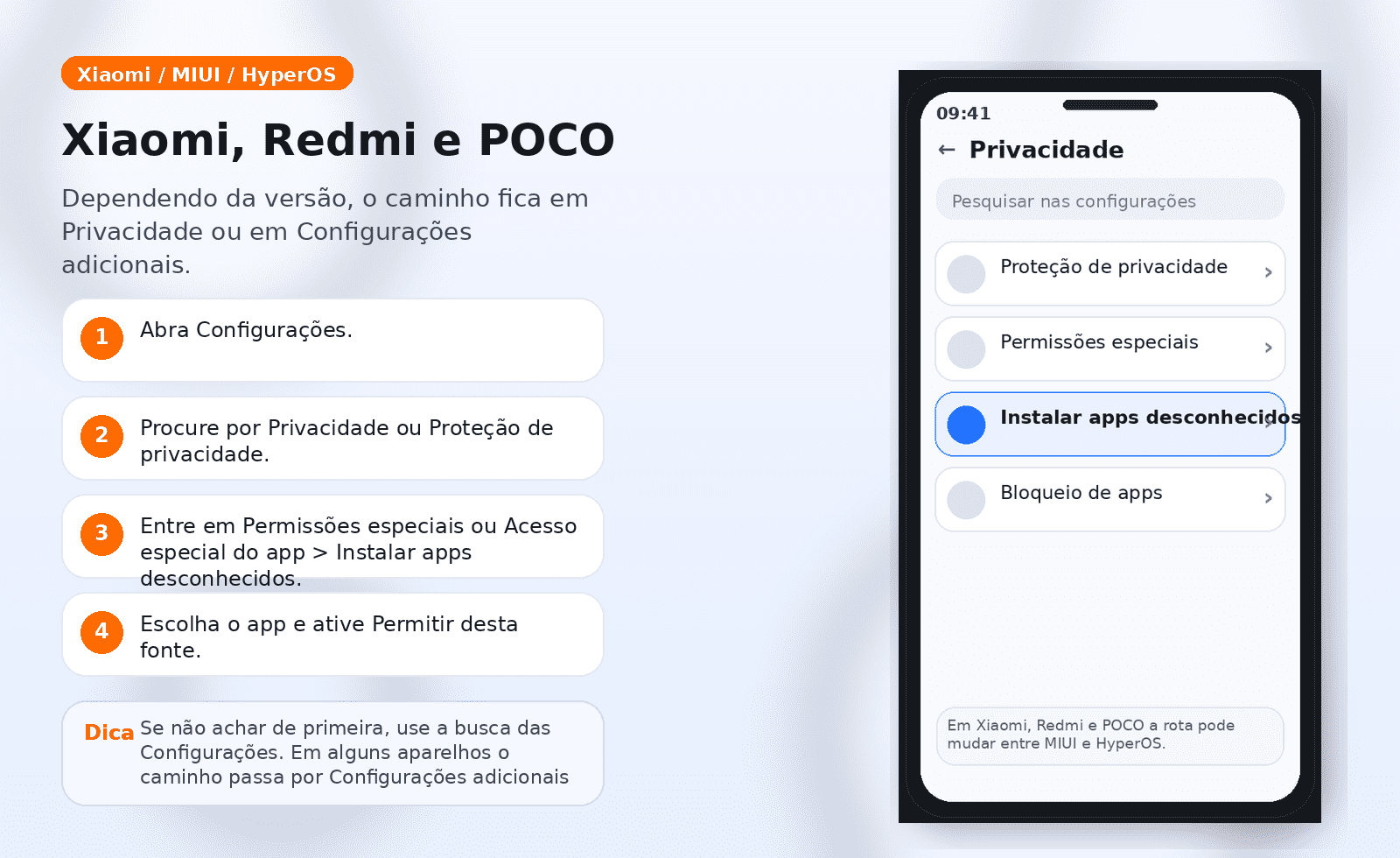 Nos aparelhos Xiaomi, Redmi e POCO, o nome dos menus pode mudar um pouco entre MIUI e HyperOS. Os caminhos mais comuns são estes: