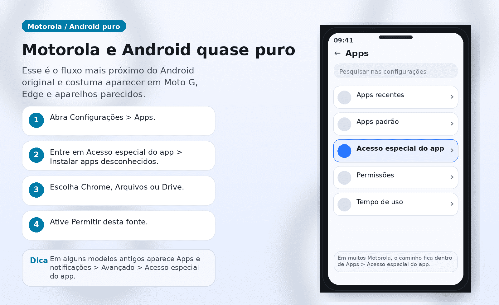 | Motorola e Android quase puro | Configurações > Apps > Acesso especial do app > Instalar apps desconhecidos |