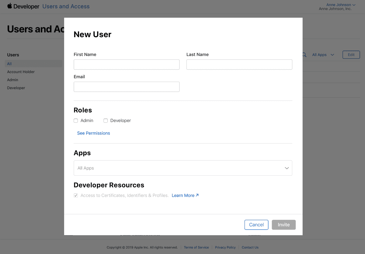 O App Store Connect foi feito para trabalhar com pessoas diferentes e permissões diferentes. O fluxo recomendado é: cada membro da equipe entra com a sua própria Conta Apple e é convidado para o time.