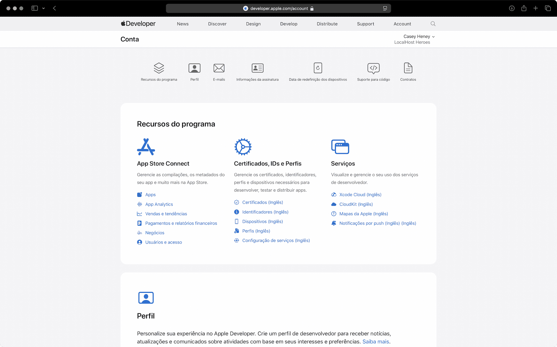 - Ao entrar na área de conta do Apple Developer, você visualiza os Recursos do programa e consegue acessar o App Store Connect e os recursos de certificados/IDs/perfis.